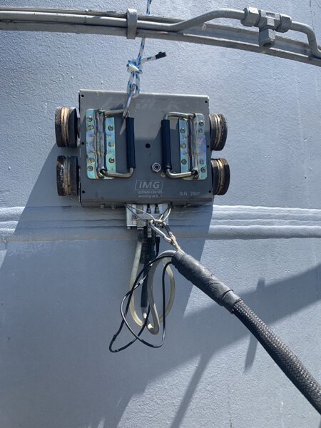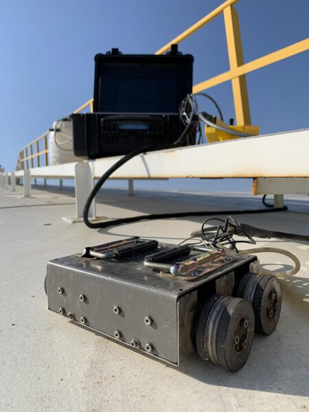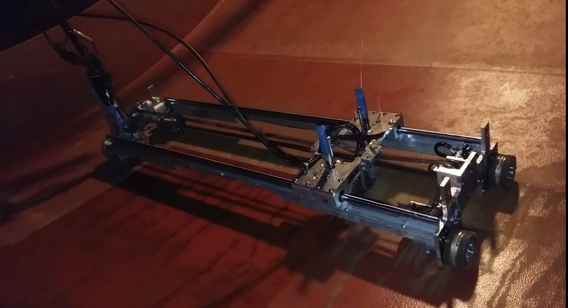 Viene utilizzato per il controllo di pareti metalliche, è un carrello a ruote magnetiche motorizzato a 4 motori indipendenti con a bordo una sonda UT in contatto continuo con la superficie in esame. È realizzato per potere seguire il profilo di superfici piane o da